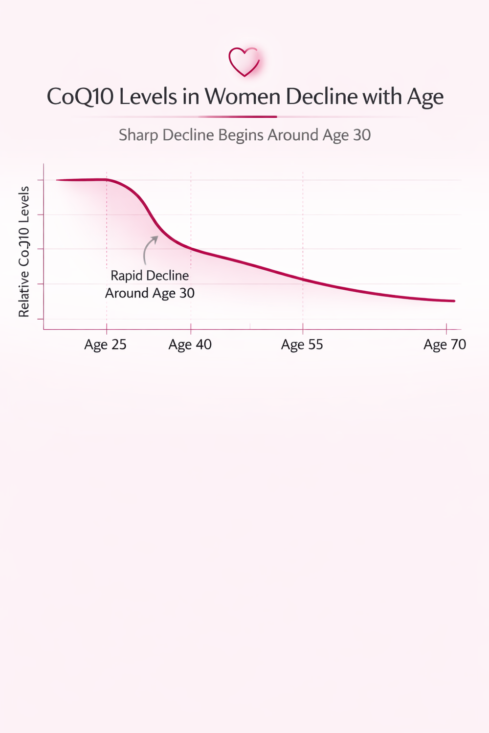From around age 30–35, natural CoQ10 levels begin to decline in women — even though the heart and body still rely on constant energy production.
